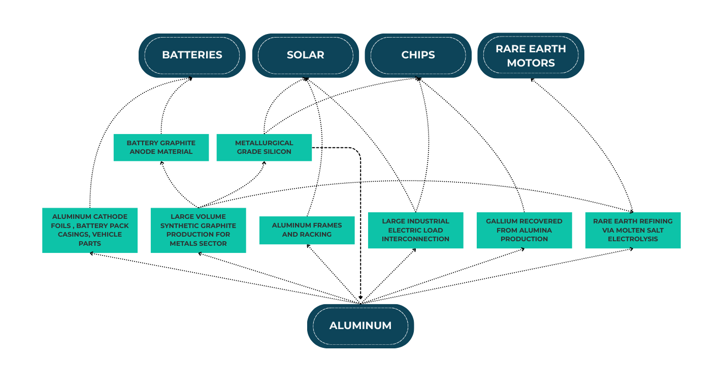 Rare earth refining, along with metallurgical-grade silicon (MGS) smelting and electric arc furnaces for steelmaking, again makes substantial use of graphite electrodes. Because metallurgical silicon is widely used in aluminum-silicon alloys, some MGS smelters in China are even co-located with aluminum smelters. With all this laid out, aluminum’s place in the electrotech industrial network appears increasingly coherent.