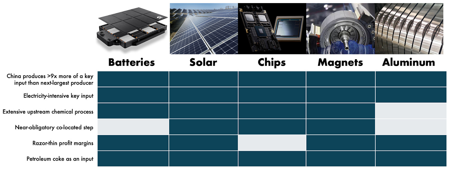 Amusingly, batteries, solar and semiconductor polysilicon, rare earth permanent magnets, and aluminum all use petroleum coke as an input—for battery graphite, metallurgical silicon, and carbon anodes, respectively. While some might scoff at petroleum coke’s significance relative to the more important industrial factors listed above, all of the electrotech stack products would be much more expensive if their production had to make use of non-fossil alternatives.